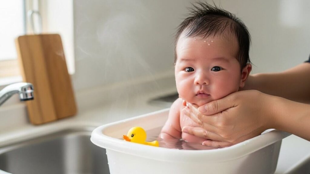 代用品は専用ベビーバスよりも滑りやすい場合があるため、安全のため赤ちゃんの身体をしっかりと支える必要があります。
