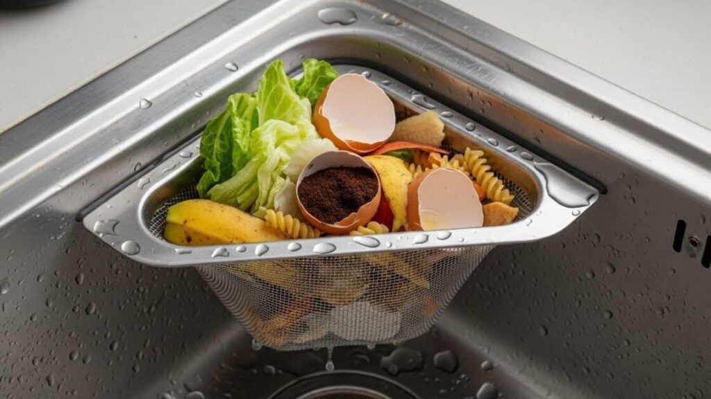 キッチンのシンクに置いて、調理中に出る野菜のくずや食べ残しなどの生ゴミを水切りしながら一時的にためておくための三角コーナー。